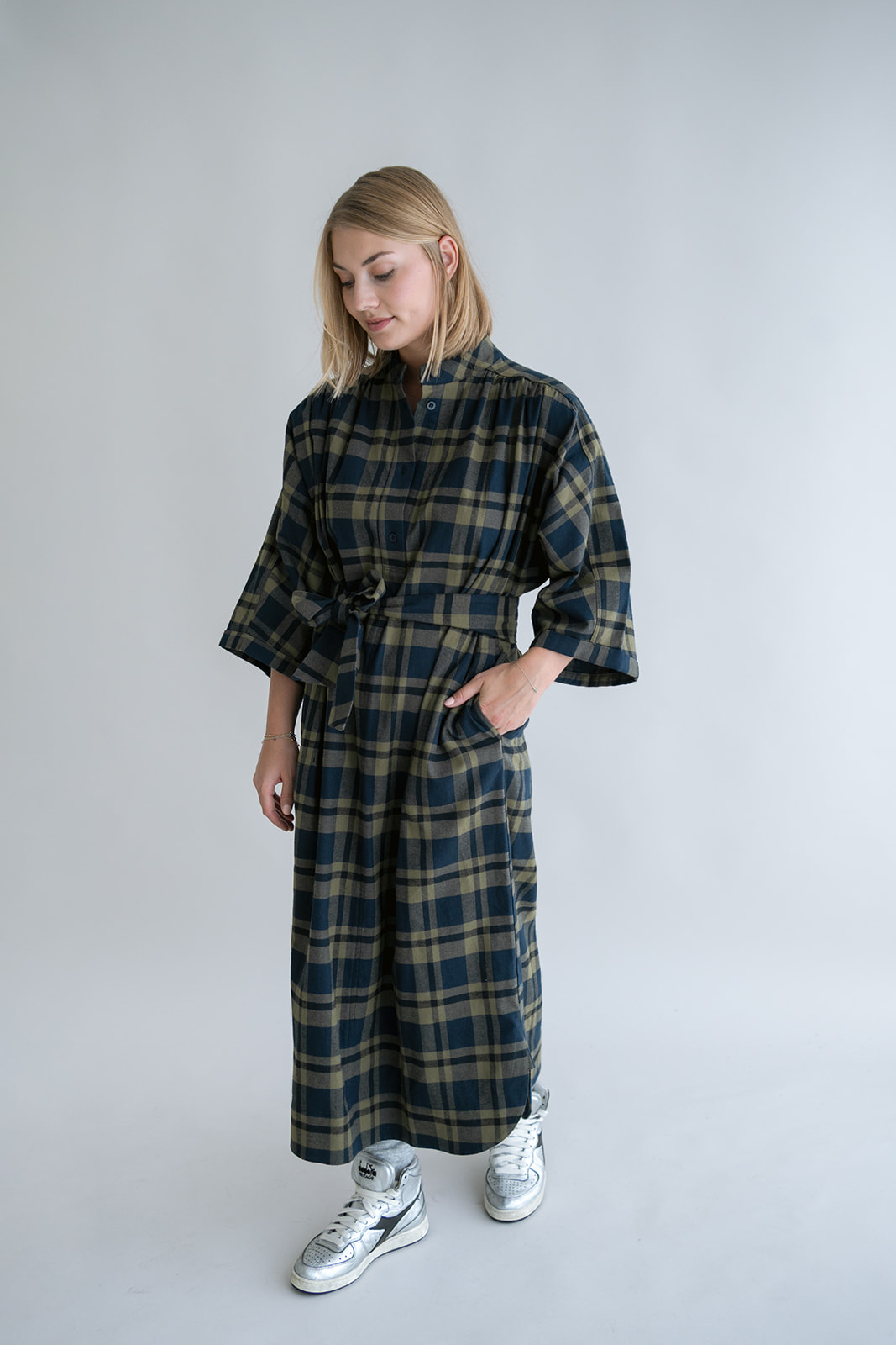 Nu is onze Ivy dress er terug in de zalig zachte groen/navy ruit! Deze jurk is het zusje van de Maya blouse. Onderaan is deze jurk afgewerkt met inkepingen, voor een vlotte look. Ze komt in 2 maten: XS/S en M/L. Het verschil in de maat zit vooral in de lengte en de jurk tailleert oversized.