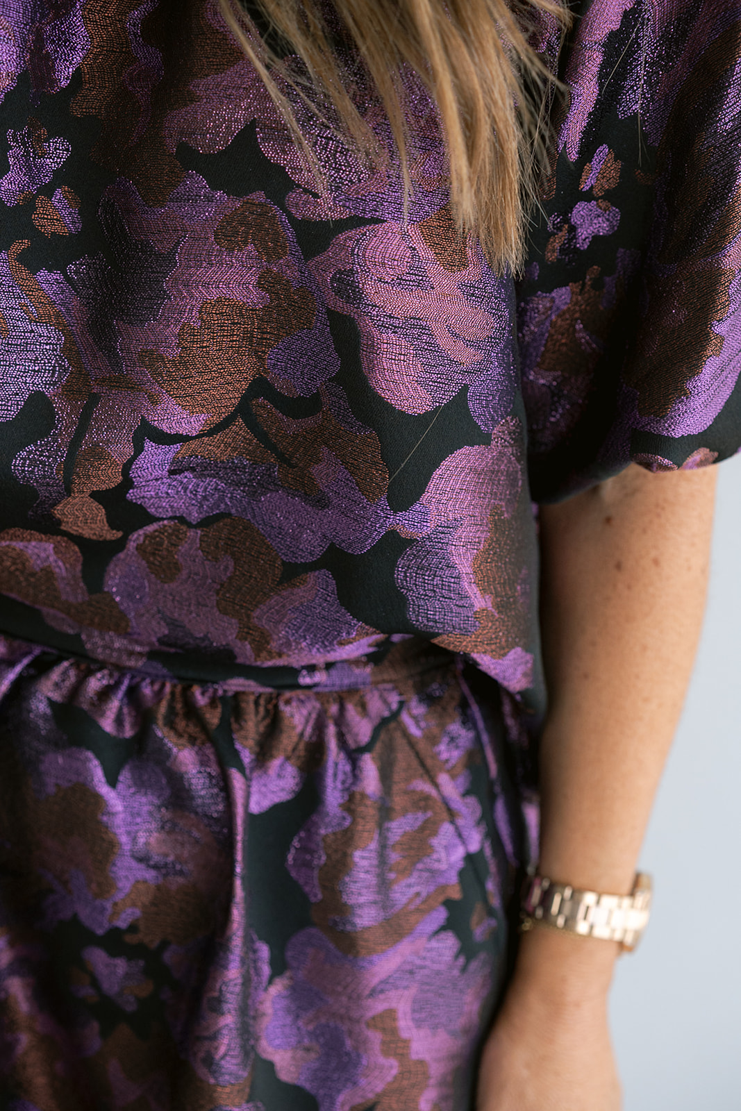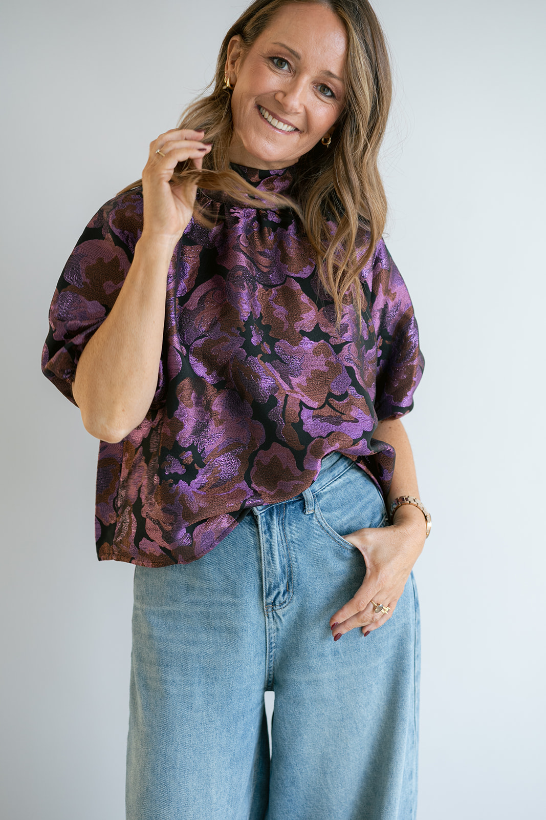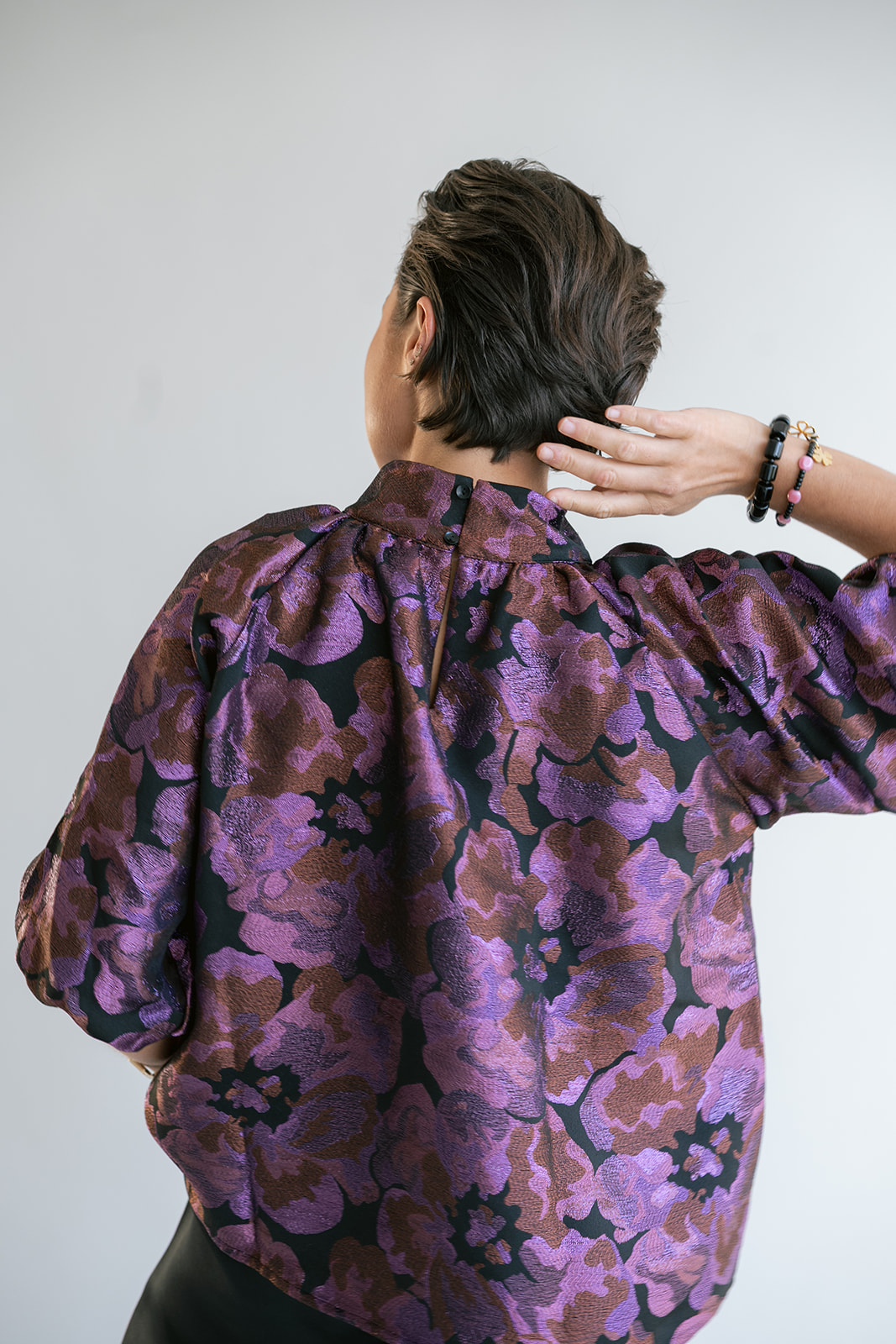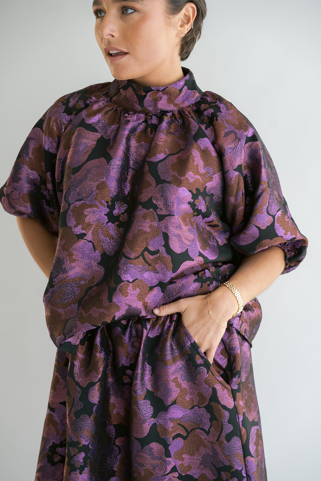 Een gekend model in onze collectie, nu in een mooie geweven jacquard stof met glinsterend detail.