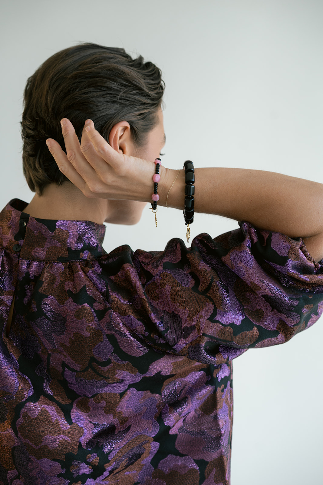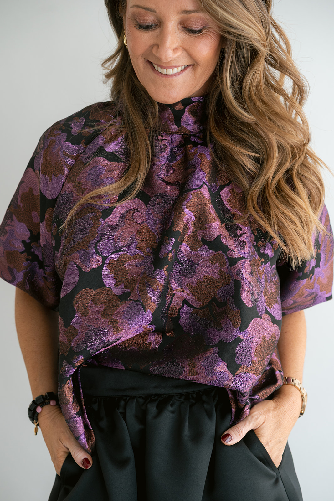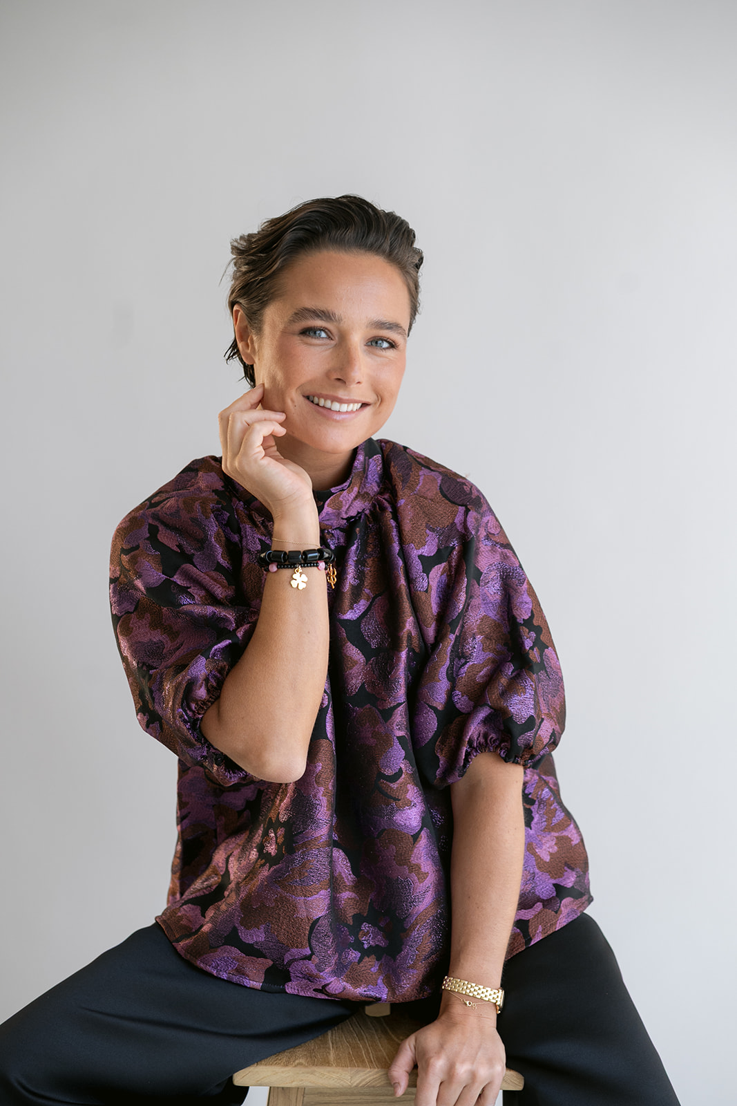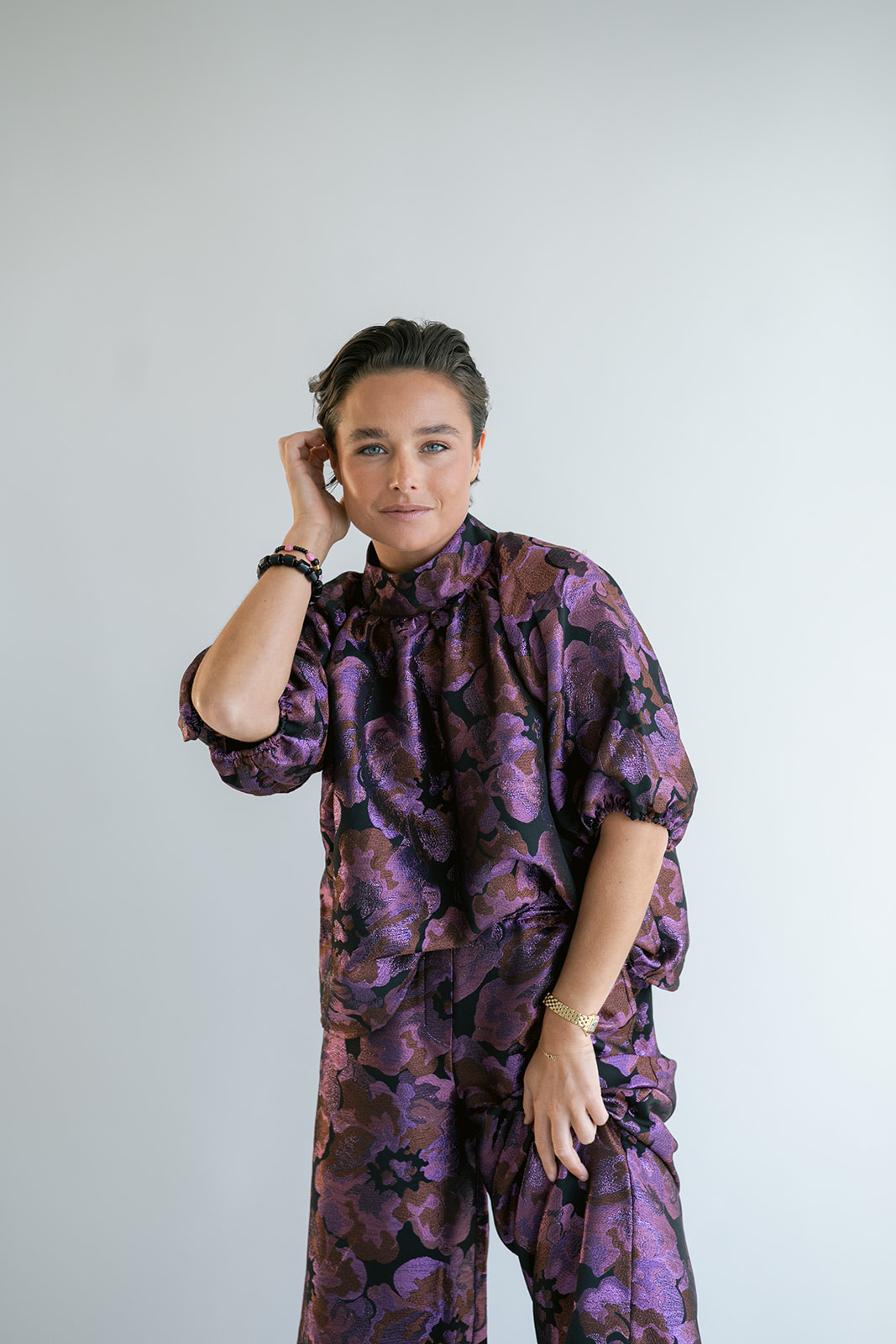 Een gekend model in onze collectie, nu in een mooie geweven jacquard stof met glinsterend detail.