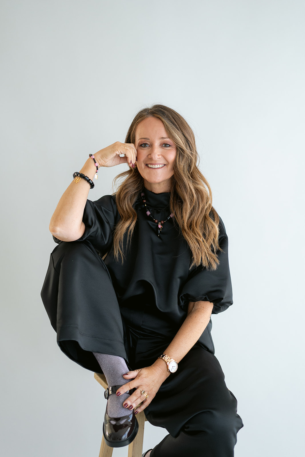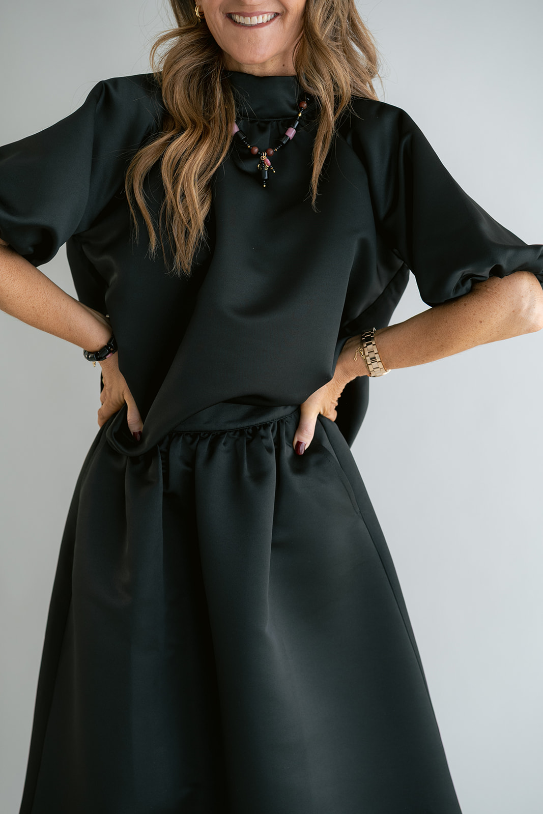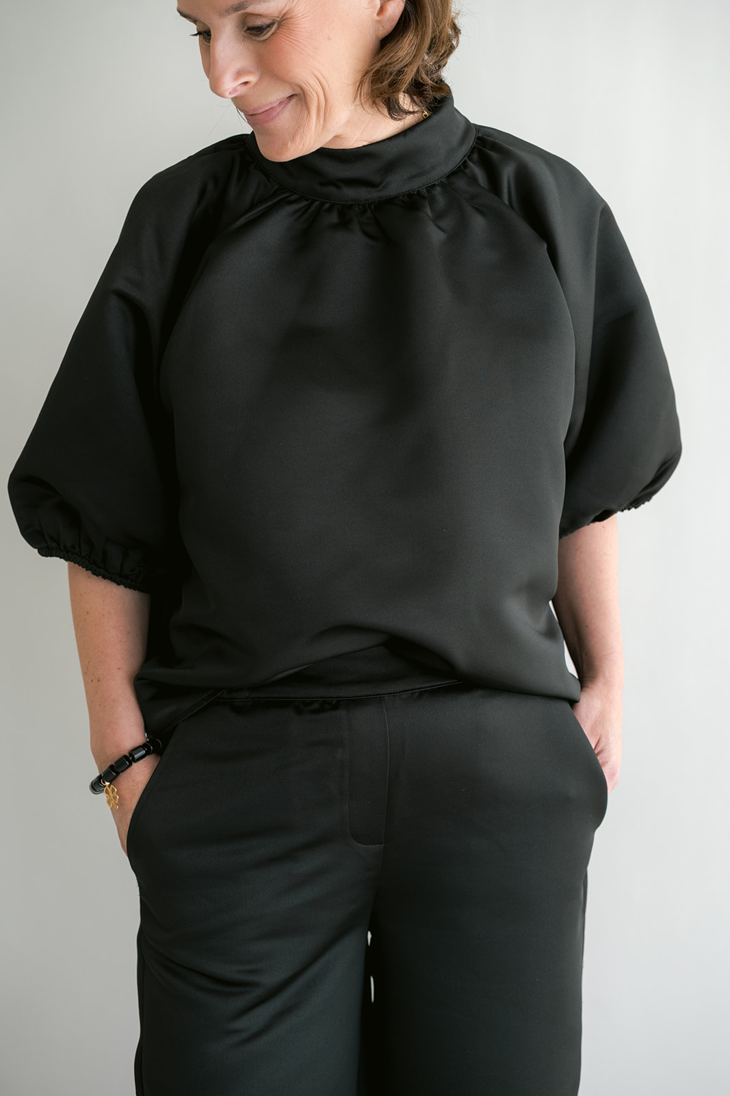 Een gekend model in onze collectie, nu in een mooie zwarte satin stof. Deze blouse valt ruim, je kan een maatje kleiner nemen.