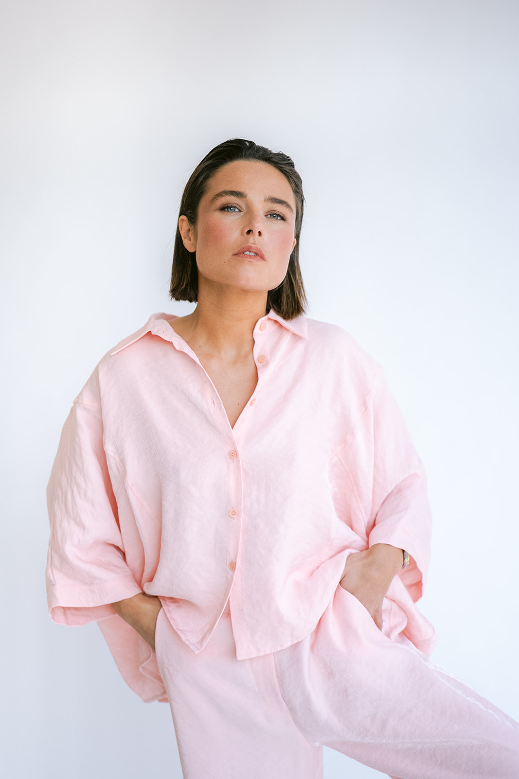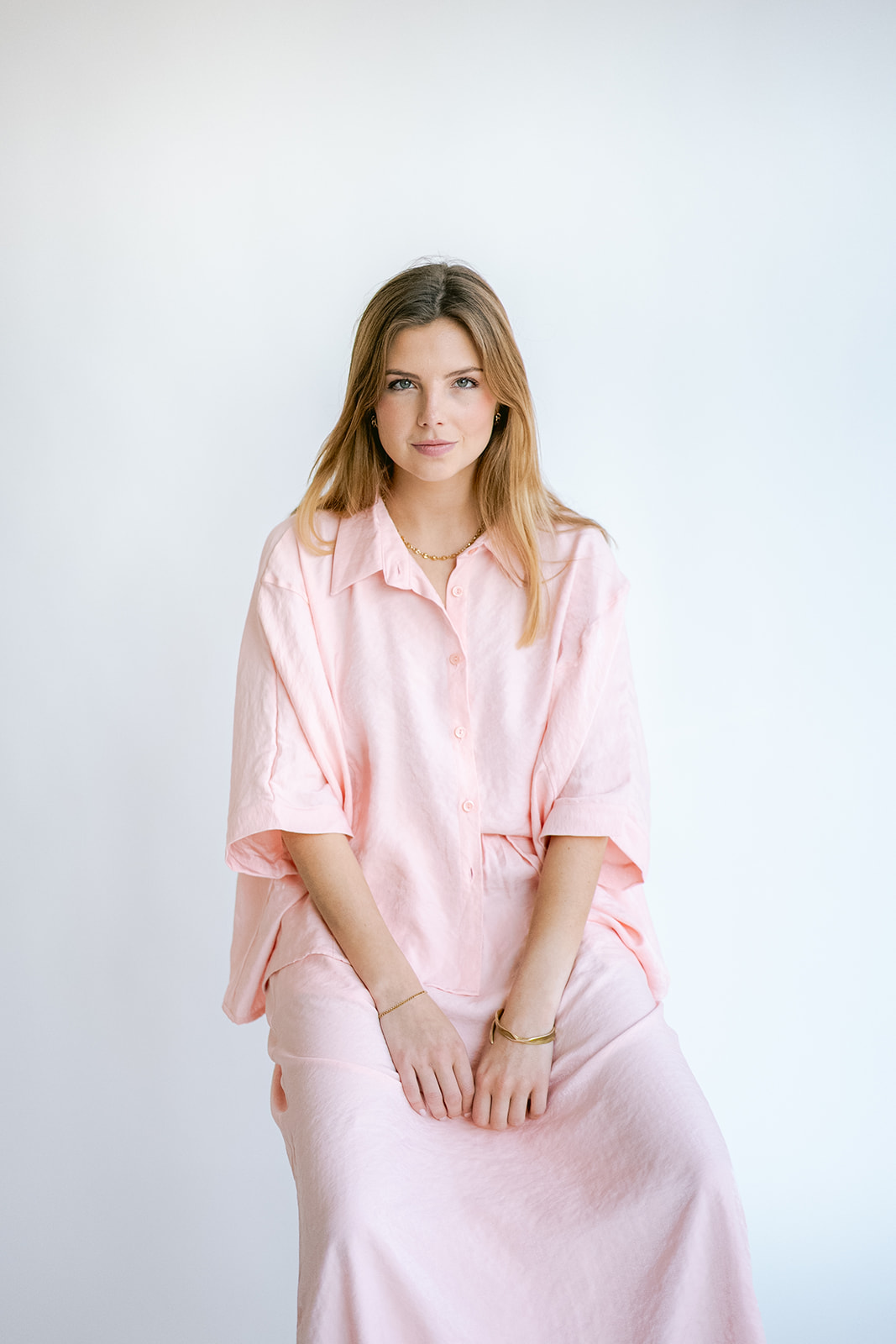 Deze licht blinkende blouse heeft een beetje een oversized fit. De blouse bestaat in 2 maten XS/S en M/L.