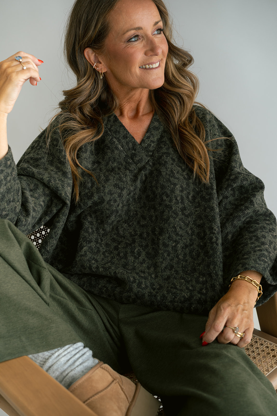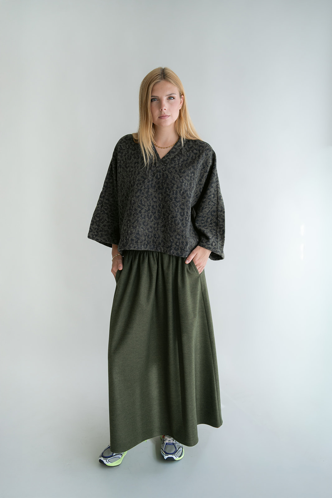 Heerlijk zacht groen top in groen leopard. De mouw van dit t-shirt is onderaan een beetje wijder.